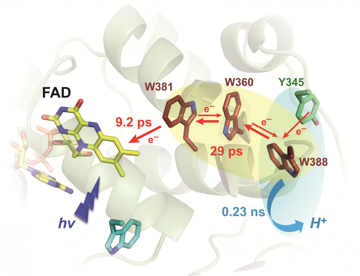 Class II photolyases utilize for the photoreduction of their flavin cofactor (FAD) a completely different tryptophan triad than most other photolyases and cryptochromes. To counter sped-up back electron transfer, they evolved an unusually fast deprotonation of the distal tryptophanyl radical cation (WH˙+) that is produced after excitation of the flavin. We studied the primary aspects of oxidized FAD photoreduction by ultrafast transient absorption spectroscopy, using the class II photolyase from Methanosarcina mazei. With a time constant of 9.2 ps, the initial reduction step of the excited flavin by the proximal W381 tryptophan proceeds almost twentyfold slower than in other photolyases carrying oxidized FAD, most likely because of the larger distance between the flavin and the proximal tryptophan. The thus formed W381H˙+ radical is tracked by transient anisotropy measurements to migrate in 29 ps with delocalization over several members of the tryptophan triad. This 29 ps phase also includes the decay of a small fraction of excited flavin, reacting on a slower timescale, and partial recombination of the FAD˙−/WH˙+ radical pair. A final kinetic phase in 230 ps is assigned to the deprotonation of W388H˙+ that occurs in competition with partial charge recombination. Interestingly, we show by comparison with the Y345F mutant that this last phase additionally involves oxidation of the Y345 phenolic group by W388H˙+, producing a small amount of neutral tyrosyl radical (YO˙). The rate of this electron transfer step is about six orders of magnitude faster than the corresponding oxidation of Y345 by the deprotonated W388˙ radical. Unlike conventional photolyases, where the electron hole accumulates on the distal tryptophan before the much slower tryptophanyl deprotonation, our data show that delocalized hole transport is concomitantly concluded by ultrafast deprotonation of W388H˙+.